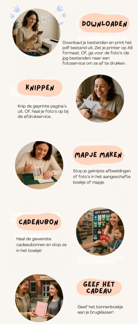 Let op dit is een digitale download. Je krijgt printbare fotokaarten met teksten om zelf cadeaubonnen achter te schuiven. Fotoboekje en cadeaubonnen zijn niet inbegrepen.